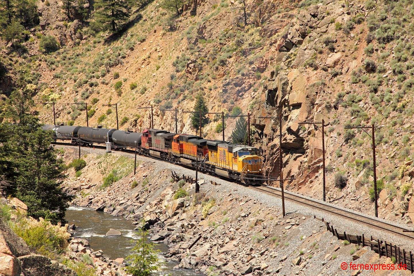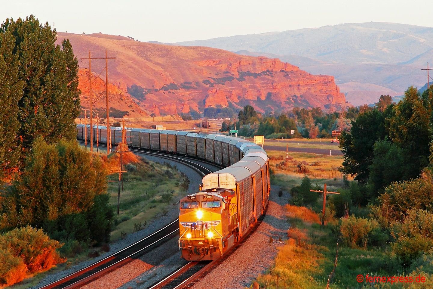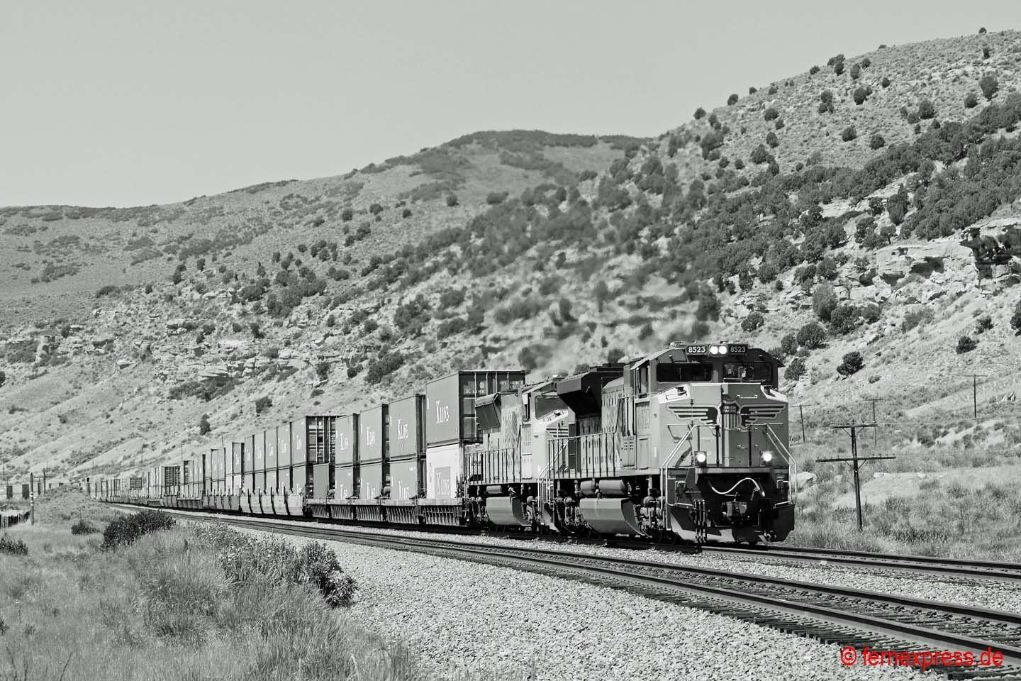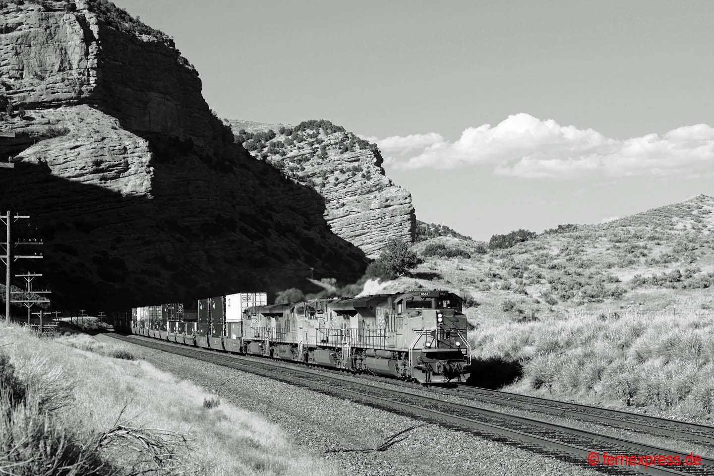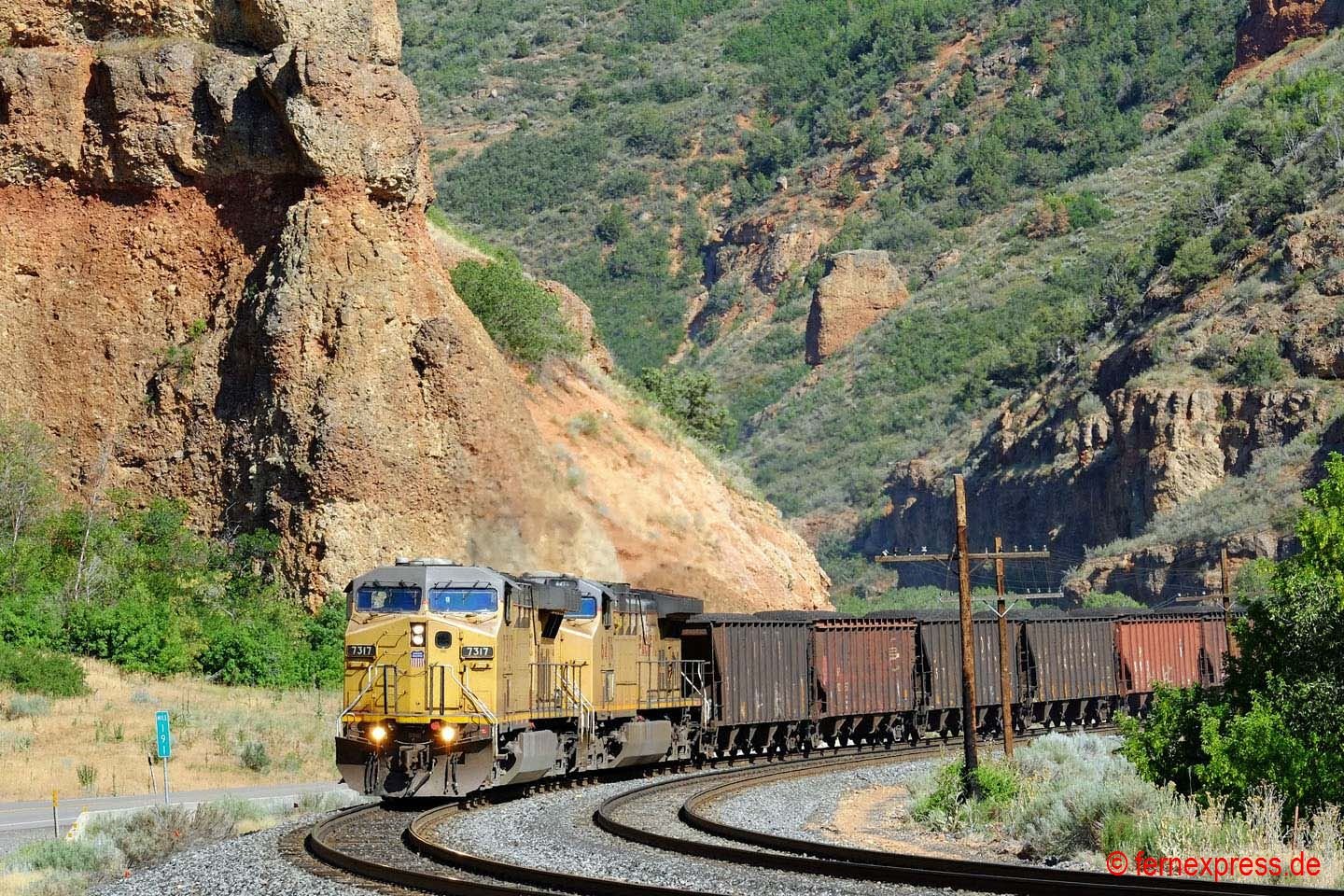 Einen guten Blick auf die westliche Einfahrt in den Echo-Canyon bietet sich in den Nachmittagsstunden wenigen Kilometer westlich des kleinen namensgebenden Örtchens Echo. Durch die roten Felsen im Hintergrund folgt die Strecke einem kleinen Flussbett bergauf. Hier hat gerade ein UP-Containerzug den Canyon verlassen. Er wird allerdings gleich in die nächste Schlucht einfahren, nach der er dann die ersten Ausläufer des Großraums Provo/Salt Lake City erreicht.