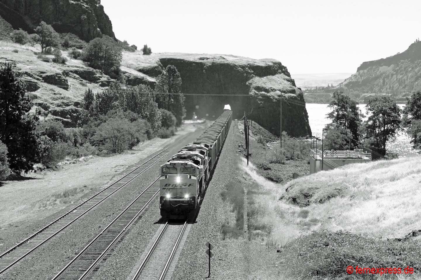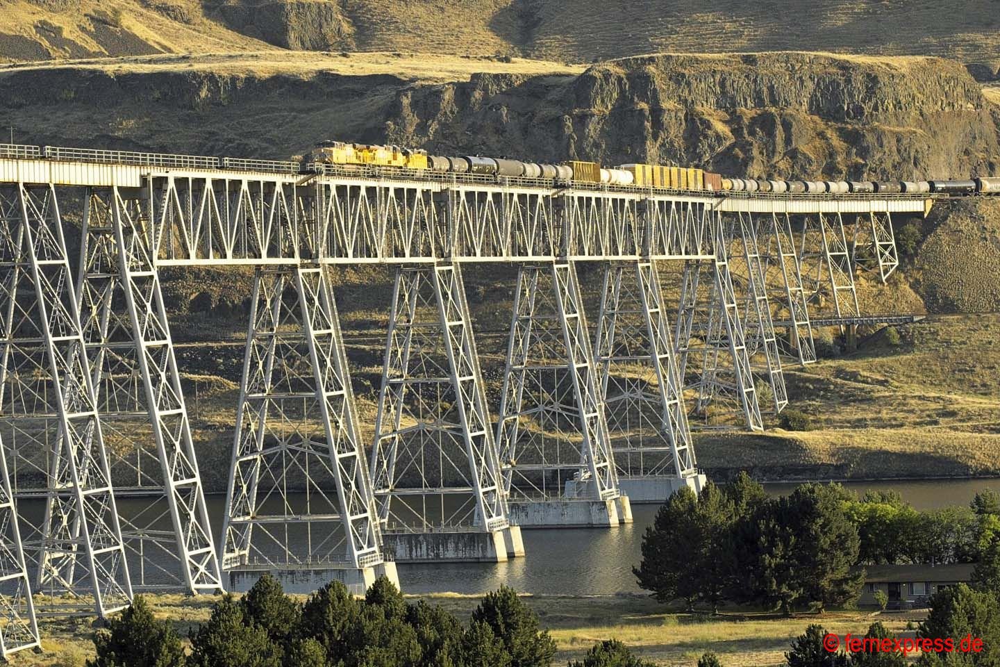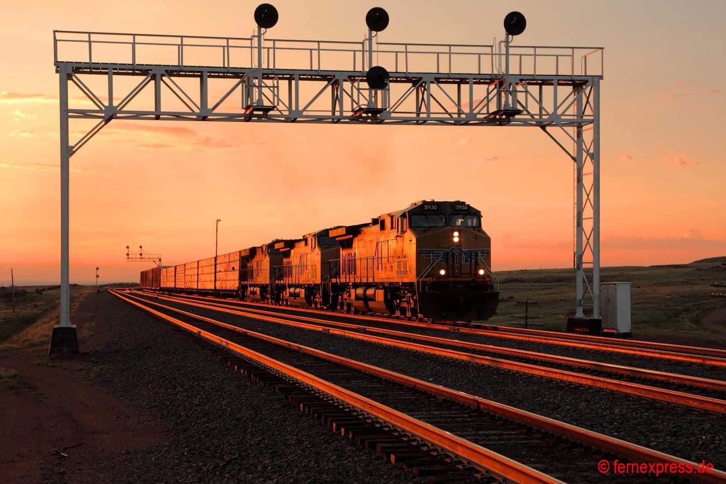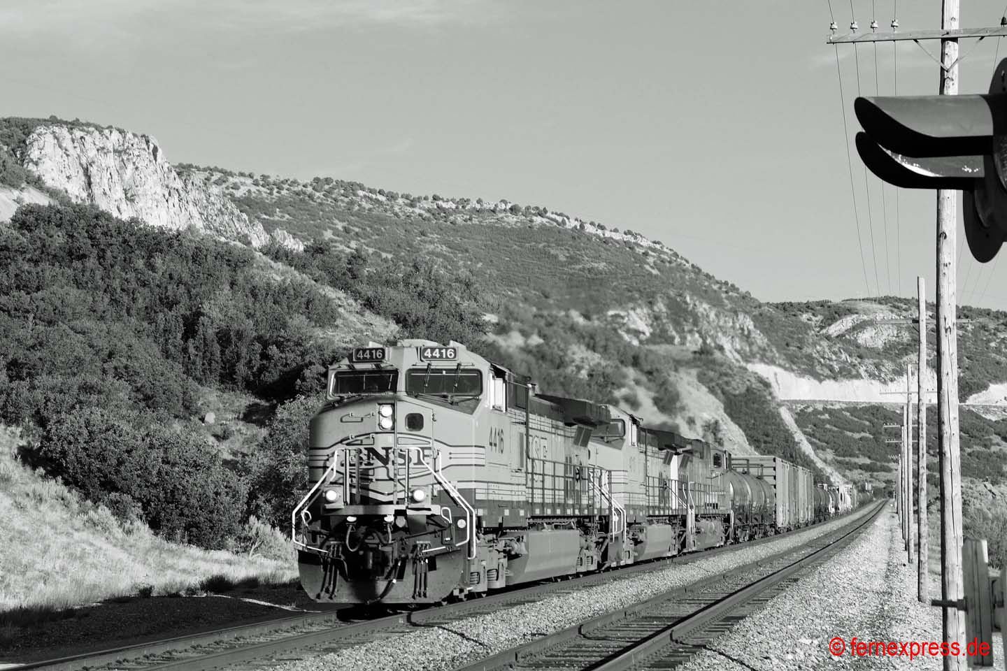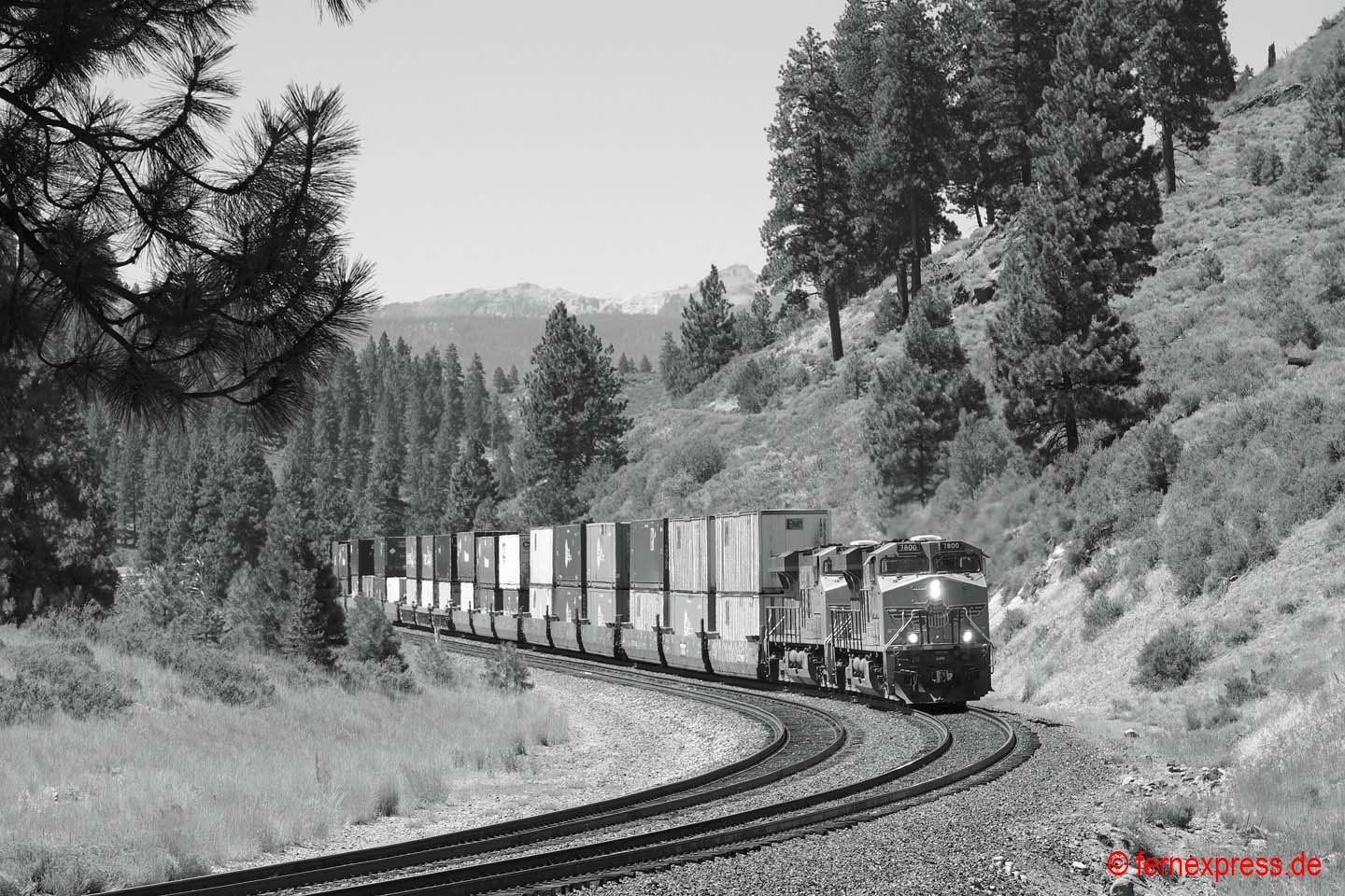 Einen guten Blick auf die westliche Einfahrt in den Echo-Canyon bietet sich in den Nachmittagsstunden wenigen Kilometer westlich des kleinen namensgebenden Örtchens Echo. Durch die roten Felsen im Hintergrund folgt die Strecke einem kleinen Flussbett bergauf. Hier hat gerade ein UP-Containerzug den Canyon verlassen. Er wird allerdings gleich in die nächste Schlucht einfahren, nach der er dann die ersten Ausläufer des Großraums Provo/Salt Lake City erreicht.