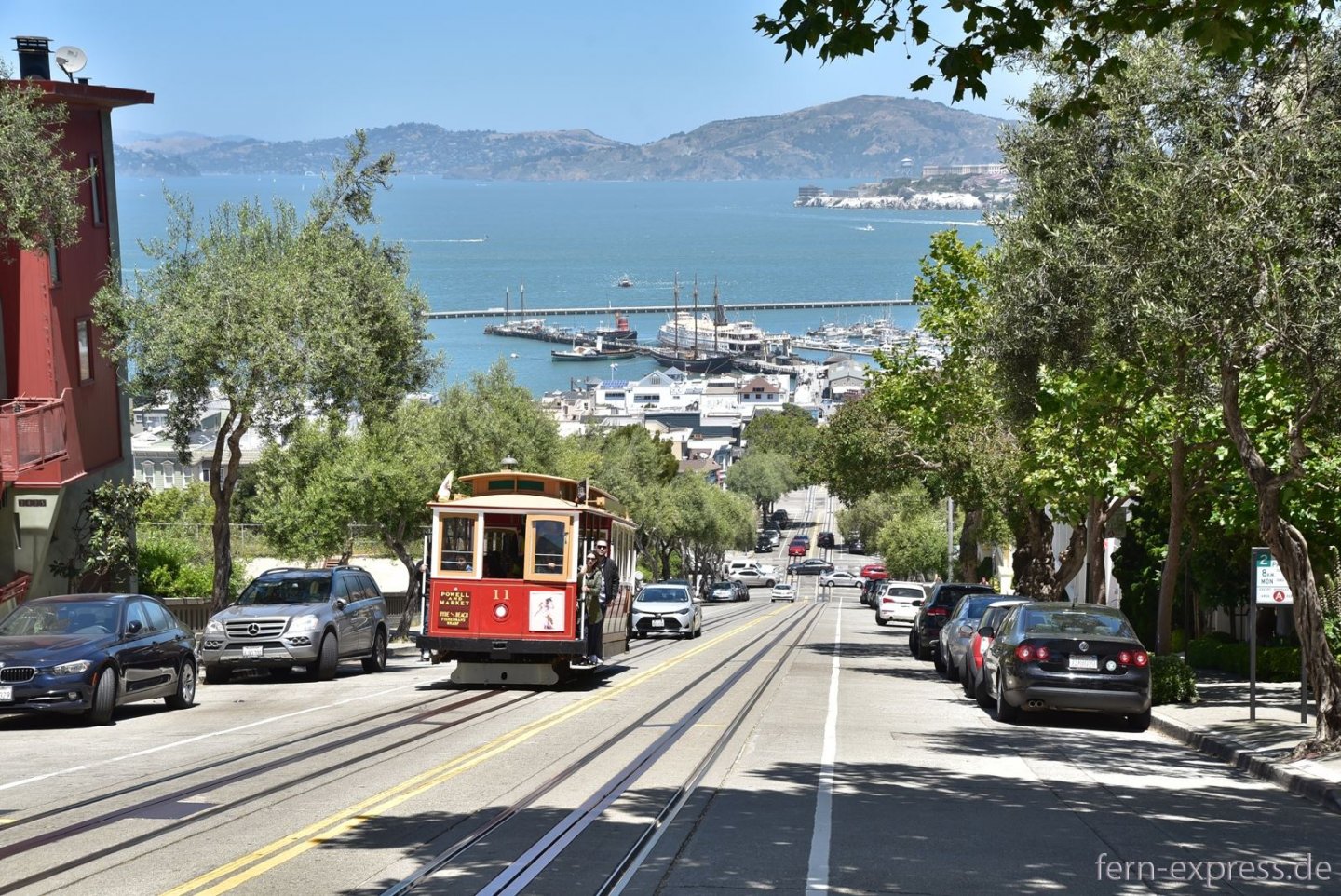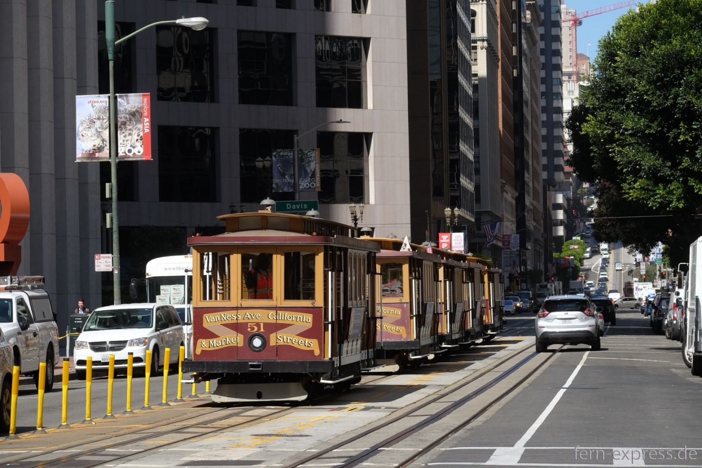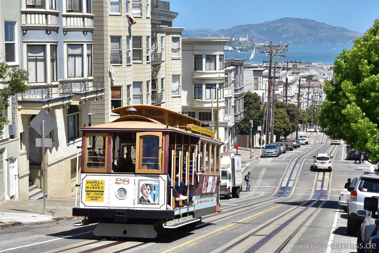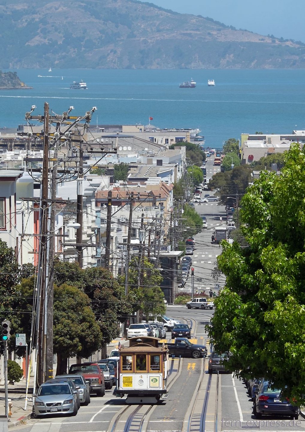 In der Jackson Street und in der Washington Street, zwei parallel verlaufenen Einbahnstraßen, werden auch die Cable Cars einspurig geführt. Im Hintergrund grüßt die Bay Bridge. (Foto: Karl-W. Koch, Juni 2018)