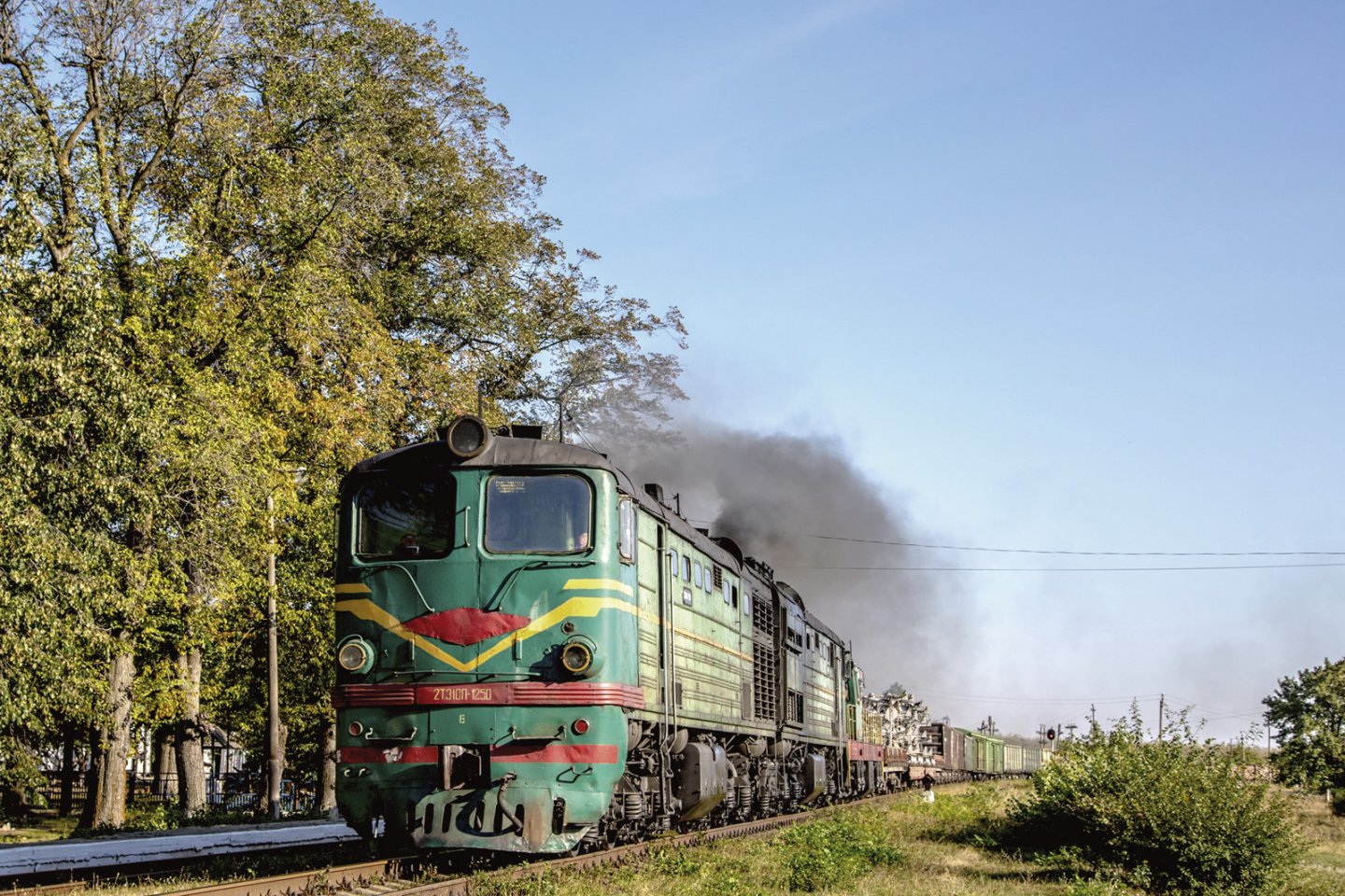 Im Morgennebel überquert ein Erzzug mit einer Zwei-Sektions 2TE10M einen aufgestauten Inhulez-Zufluss auf der Fahrt von Petrove-Mine zur Aufbereitungsanlage Myrivske. (2. Okt. 2019 – Foto: Thorge Bockholt)
